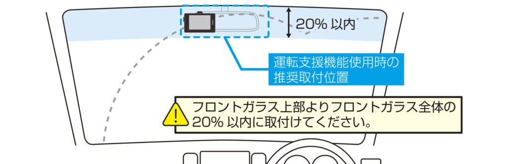●フロントガラスへの取付けは、道路運送車両法に基づく保安基準により設置場所が限定されています。フロントガラス上部より20%以内になるように設置してください。※道路運送車両の保安基準第29条(窓ガラス)、細目告示第195条および別添37