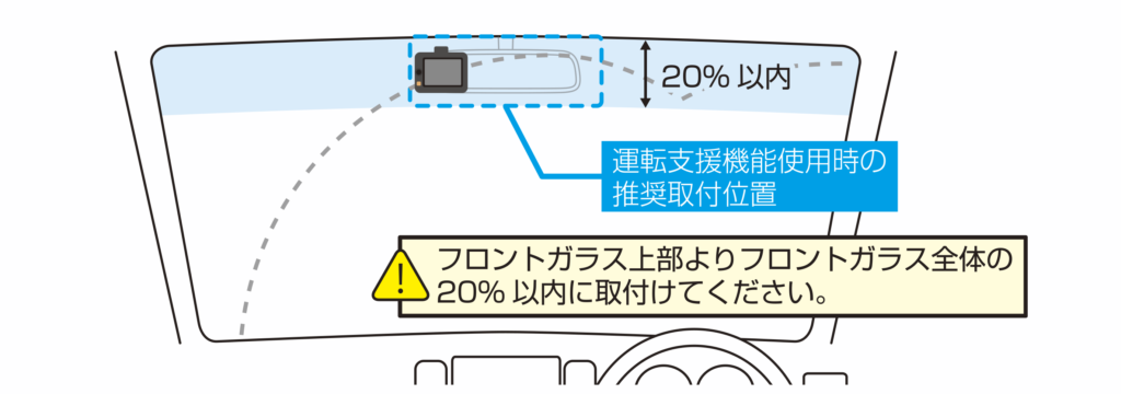 ●フロントガラスへの取付けは、道路運送車両法に基づく保安基準によりフロントガラス上部より20%以内に設置するよう、設置場所が限定されています。