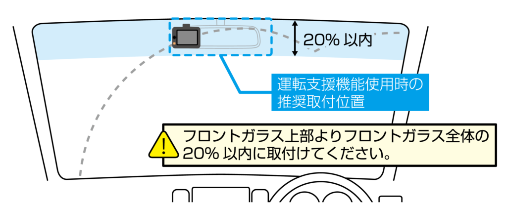 ●フロントガラスへの取付けは、道路運送車両法に基づく保安基準によりフロントガラス上部より20%以内に設置するよう、設置場所が限定されています。