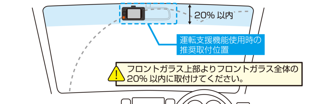 ●フロントガラスへの取付けは、道路運送車両法に基づく保安基準によりフロントガラス上部より20%以内に設置するよう、設置場所が限定されています。※道路運送車両の保安基準第29条(窓ガラス)、細目告示第195条および別添37